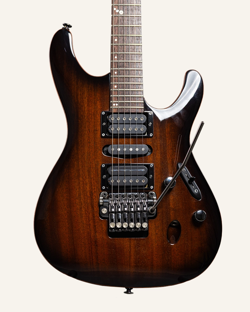 Body & Tone – Solid mahogany body delivers warm midrange and natural resonance, while the contoured S‑series shape keeps weight minimal and feel aggressive.