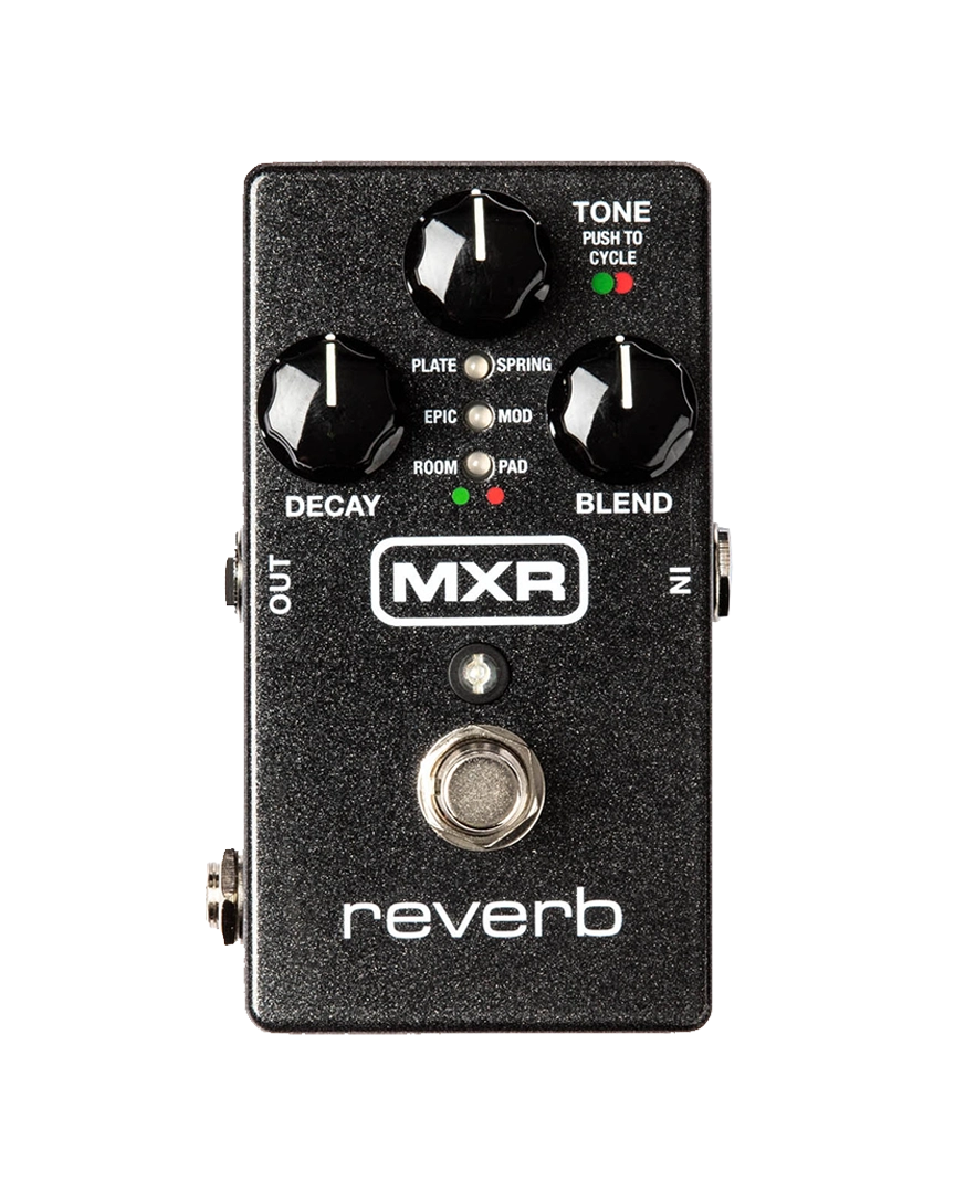 The MXR M300 Reverb delivers studio-quality reverb in a compact, pedalboard-friendly enclosure. It offers six reverb types accessible via a mode selector: Plate, Spring, Epic, Mod, Room, and Pad. Each mode is designed to provide musical, usable ambience ranging from subtle room sounds to expansive ambient textures.